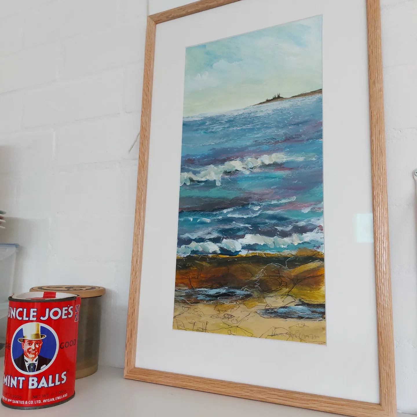 This work was painted from Ebbe’s Snook, Beadnell, Northumberland in September 2023. I was looking south towards Dunstanburgh Castle on a hot, bright day. The waves lapped at the rocky shore of the outcrop and the sea sparkled like diamonds. Curlews called.